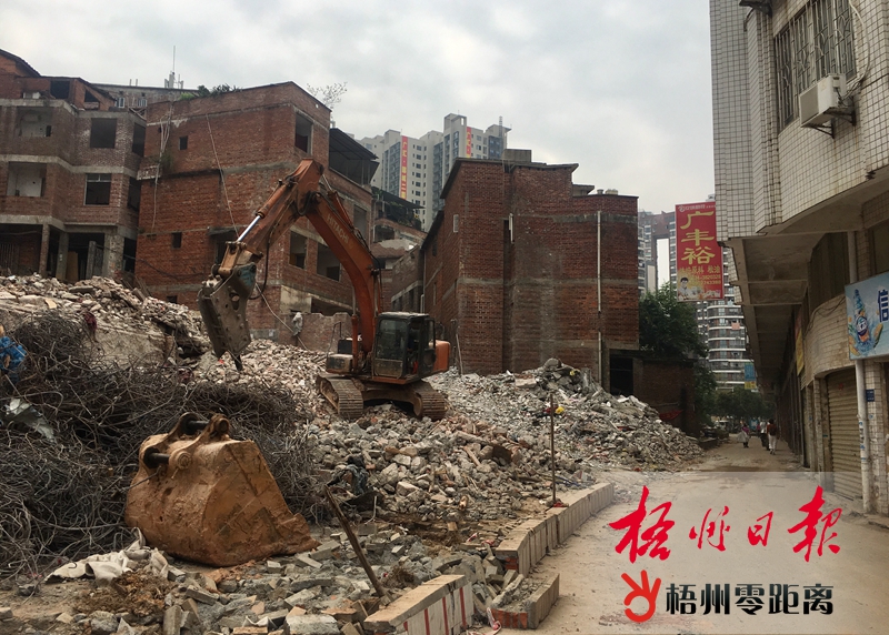 4月8日,在新興二路小學往長洲區政府的道路,施工機械正拆除路邊的建筑。