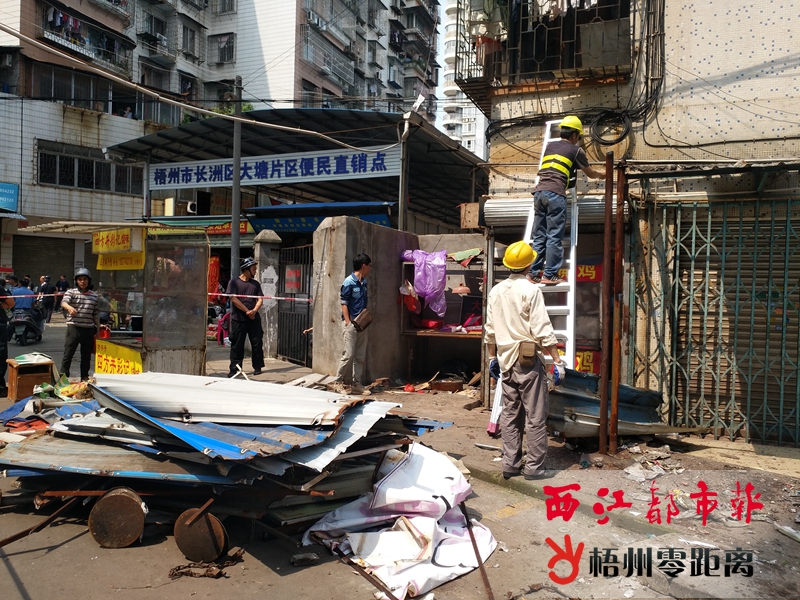 梧州零距離網-西江都市報訊 (記者 蒙敏瑩 通訊員 江勤 歐彩云) 去年以來,城管等相關部門對長洲區大塘市場周邊亂擺賣、跨門檻經營、違規搭建遮陽篷等亂象進行過集中整治,但在近期,市場周邊亂象出現了反彈。4月9日,新興路嚴管街長洲街長團隊組織多個部門,對這些亂象開展專項整治。
