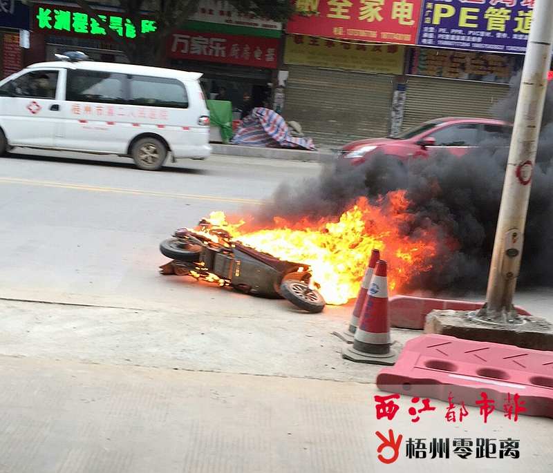 梧州零距離網-西江都市報訊(記者 蒙敏瑩 實習生 廖秋梅)4月11日,新興二路兩廣批發市場路段一輛電動車突然起火,所幸被兩廣市場管理方工作人員及時發現并撲滅。事故未造成人員傷亡。
