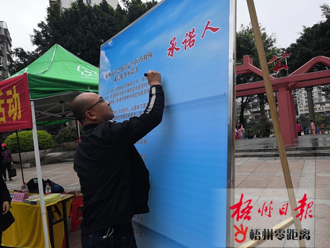 4月13日,“打擊欺詐騙保”集中宣傳活動在潘塘公園廣場舉行,醫院與連鎖零售藥店相關負責人在活動現場簽訂“梧州市社會保險定點醫藥機構誠信服務承諾書”。 柳雙 攝
