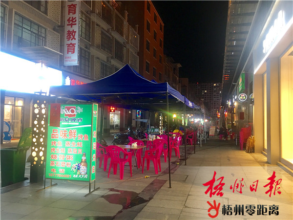 梧州日報記者 盧海燕 夜間時段,約上三五朋友去餐飲場所進行猜碼劃拳、談天說地等“接地氣”的夜宵活動是很多市民的日常。但據市民反映,龍圩區南寧百貨入駐的一樓臨街燒烤店對居住在附近的居民影響頗大,這些燒烤店對面就是私人屋,居住在此的居民們,每天晚上聽著燒烤店顧客的猜碼聲、談話聲等噪音導致無法入睡,甚至有些顧客喝多了到燒烤店對面的私人屋門口做出隨意小便等不雅行為,令屋主甚是困擾。這些燒烤店雖然在室內完成制作過程,但也有大部分在露天燒烤,對周圍環境影響頗大,異味嚴重。 記者調查:晚上11時后最熱鬧 4月9日晚上11時,記者來到龍圩區南寧百貨一樓,看到臨街五六家燒烤店生意正紅火,空氣中彌漫著油煙味。燒烤店的多套桌椅早已在人行道上鋪開,不少已經坐著食客了,人們喝著啤酒吃著燒烤高談闊論,有的甚至大聲地劃拳猜碼,場面十分熱鬧。記者觀察了燒烤店對面的房屋,基本上都是關著窗戶的。