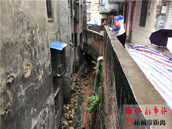 梧州零距離網-西江都市報訊(記者 謝韻 通訊員 黎海平)4月13日上午9時許,梧州市工廠二路上沖一級21號民房后擋土墻發生塌方。為了居民安全,相關職能部門采取應急措施,并動員附近的7戶居民撤離。截至16日上午9時許,該處居民已全部撤離地災隱患點。 4月13日上午9時許,下沖社區工作人員接到居民發來的信息,反映在工廠二路上沖一級21號民房后背的擋土墻發生塌方。社區方面立刻組織人員前往現場,發現擋土墻確實發生大面積塌方,由于塌方的墻體與民房相距僅有兩三米,塌方掉落的磚塊及墻內外露的黃泥都威脅著該民房的安全。此外,位于塌方現場上方的上沖二級15-18號居民樓門前的一條小路,也產生了裂縫。