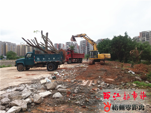 4月16日,龍圩區龍湖小學建設校址處,施工方正在繁忙施工作業,對該處的綠化樹進行移植,為龍湖小學的開建做好前期準備。