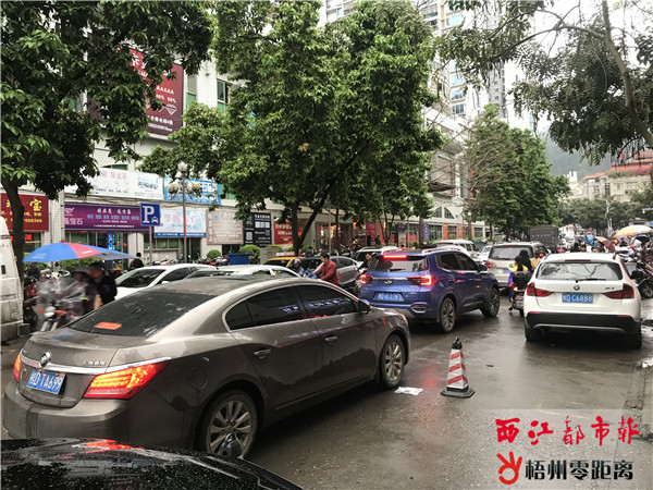 4月15日下午下班高峰期,寶石城東門路段道路兩邊停滿了車輛,車輛通行變得困難。陳素雅 攝 “到梧州寶石城和西環(huán)市場買菜的車主亂停車是常態(tài),社區(qū)和寶石城工作人員都會派人來管理,但占道停放的車輛太多了。”該路段一蛋糕店老板表示,每天下午下班時間車流量激增,亂停的車輛在停車位外停成一排,占據(jù)了路道一半位置。 “靠近醫(yī)院的路段有一定的坡度,兩旁還是停滿了車輛,當有大貨車進入工廠時,小車不讓大貨車,該路段就會堵塞幾個小時。”瑪麗婭婦產(chǎn)醫(yī)院保安黃先生表示,許多小車、兩輪車車主把該段路當成“天然停車場”,有位就停。 針對此現(xiàn)象,記者采訪了正在維持秩序的梧州市鼎豪城市管理服務(wù)有限公司工作人員。“梧州寶石城東門路段從撤銷路邊攤后交通狀況大為改善,但寶石城外來人口與車輛眾多,加上西環(huán)市場人流密集,車輛一旦停放過多,難免造成堵塞。”該公司工作人員梁先生表示,政府與公司簽訂了購買服務(wù)合約,委托他們每日在該路段治理五亂、疏通車輛和維持交通。每天下午5:30至6:30高峰期,公司還會加派兩人或三人管理。