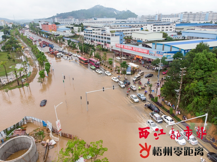 4月20日11時許,梧州高新區工業大道星和一路路口積水逐步消退,車輛緩慢通行。 陳凡 攝 據有關人員初步查明,梧州高新區工業大道旁有一處在建項目,因施工失誤導致園區南側通往桂江的排水渠被破壞,造成主排水渠管道內泥沙堆積,管道嚴重堵塞。今年春節后,有關部門已開始對雨水排水渠進行修復。由于近期降雨密集,導致工程有所延誤,目前受損壞的雨水排水渠修復施工仍未完成,所以導致內澇再次出現。 |