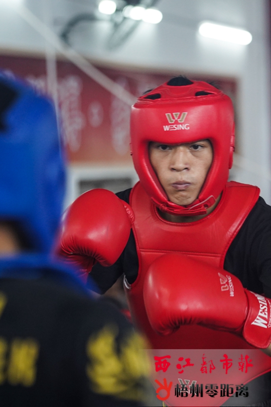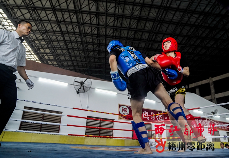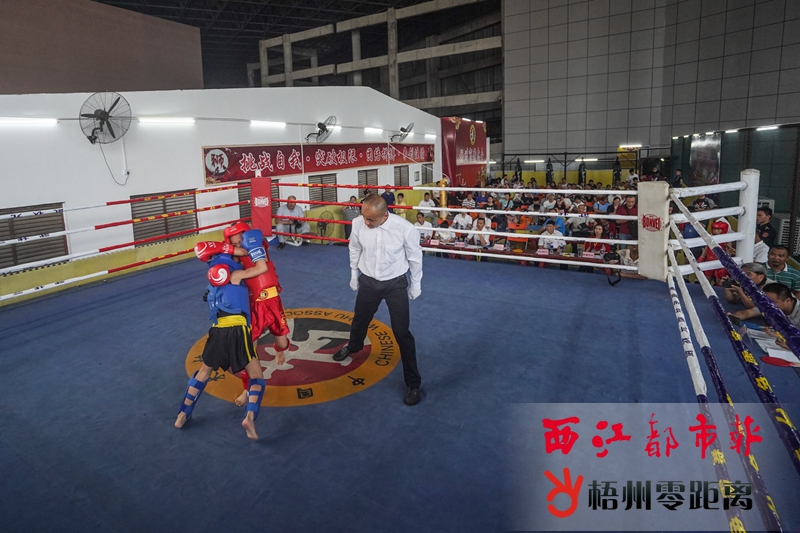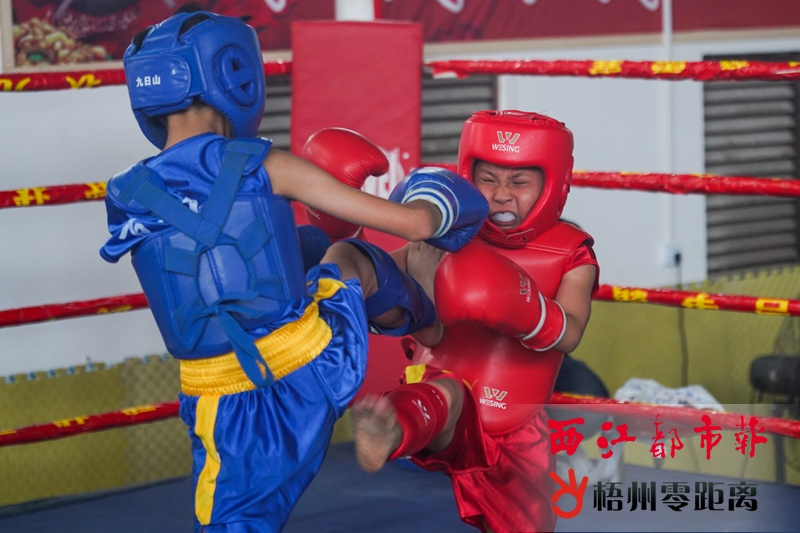 比賽擂臺,給練習武術散打的小將們提供一個展示自我的平臺。 距離比賽開始還有一段時間,選手們已迫不及待地換上比賽服裝與護具,在一旁做著熱身運動,蓄勢待發。當天14時許,比賽正式開戰,經過賽前選拔,共有26名選手進入比賽。選手年齡在9歲至18歲之間,分別來自梧州市區、蒼梧縣、蒙山縣、藤縣、岑溪市等地的武術俱樂部,按照年齡與體重分為不同的組別進行比賽。 與傳統武術偏向表演型的比賽不同,武術散打比賽是實戰格斗,雙方按擊打對手頭部、軀干等部位,以及摔倒、擊落對手等動作累計積分,經過裁判員統計后評判本輪比賽的勝負。比賽考驗選手戰術、技巧、速度、力量、耐力等全方位的能力,選手需擁有強壯的身體素質。 賽事首先進行的是低年齡組別比賽,這些不滿10歲的選手體重為30公斤級別,身材嬌小的他們蘊含著強大的爆發力,一開場就火力全開,短短幾秒時間分別擊打對手十余次,節奏刺激暢快。隨著賽事深入,經驗豐富的高年齡組別選手陸續登場,他們的比賽更講究走位,看準時機才出招制敵,迅速揮灑出一連套行云流水的擊打動作。