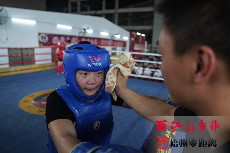 每個回合結束,教練員都會抓緊時間給選手擦汗、洗牙套、鼓勁和總結經驗。 該項大賽由梧州市人民政府主辦,中共梧州市委宣傳部、梧州市文化廣電體育和旅游局等多個部門承辦,屬2019年梧州市市民運動會項目之一。賽事執行單位梧州市武術協會的會長覃劍華表示,武術散打在梧州仍屬起步階段,但此次賽事舉辦的效果顯示,市內有眾多青少年對散打運動頗感興趣,也有不少場館開設了專業的散打課程,梧州散打運動擁有優良的發展基礎。 文字: 西江都市報記者 鄧發浩 圖片: 西江都市報記者 楊 揚 |