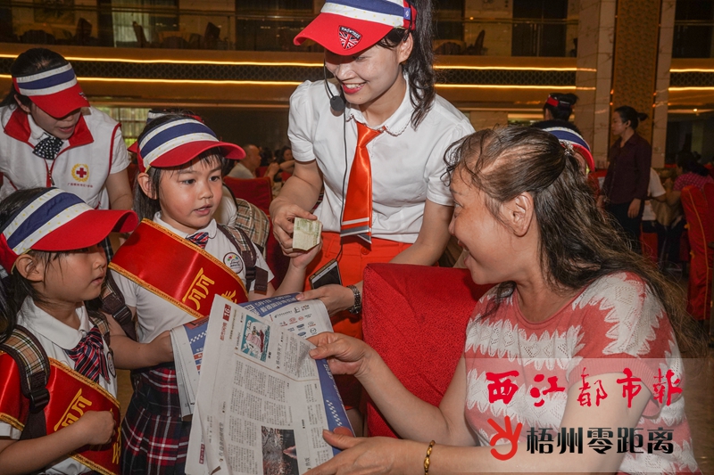 當天,為響應“走進鄉(xiāng)村·牽手助學”行動的倡議,幫助梧州市偏遠山村的學生,梧州市紅十字會和梧州市麗港幼兒園組織愛心小報童,在麗港華府酒店進行《西江都市報》義賣活動。小報童們通過自己的行動,為山村的學生奉獻一份愛心。據(jù)悉,當天活動共籌得善款615元。
