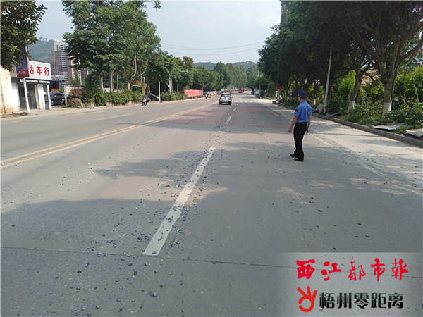4月26日,一輛運(yùn)輸砂石的車輛在富民三路梧州學(xué)院對(duì)開(kāi)路段行駛時(shí),未做好密閉措施造成角石灑落,污染城市道路。由于當(dāng)事人的行為已違反相關(guān)條例,梧州市城市管理監(jiān)督局對(duì)其予以行政處罰2000元。記者 吳艷虹 通訊員 張文裕 攝
