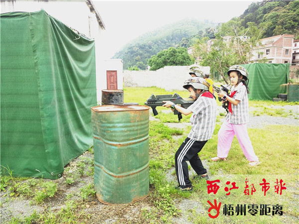 完成挑戰的學生按壓地樁網,幫助組員們順利跨越。 “接下來,我們開始戰術射擊。”教官話音剛落,學生們一陣歡呼雀躍,這是不少學生最期待的軍體項目。進入梧州軍博園戰術射擊野戰區內,教官先給學生們做了簡要培訓,然后按照要求,學生們被分成兩組并迅速穿好“作戰服”,配上裝備,像一個個整裝待發的“小戰士”。