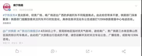 網絡截圖 零妹從中國鐵路南寧局集團有限公司梧州車務段了解到,受廣東地區強對流天氣影響,4月30日中午時段后,多趟進出梧州南站的動車出現了晚點的情況。梧州南站通過及時加開退改簽窗口、增設公告欄公布列車晚點情況、為部分列車旅客提供面包和礦泉水等措施,做好宣傳解釋工作,安撫旅客情緒,車站秩序維持良好,未出現大量旅客滯留情況。今日早上,進出梧州南站的動車已恢復準點運行。 另外,梧州市公路運輸管理處也根據昨晚動車晚點情況,通知梧州市城建公共交通有限公司臨時延長公交運行時間,加大運力投入。當晚11時至11時30分,城建公交公司陸續增開多趟公交車進行支援,直至把最后一批出站乘客轉移完畢。增設的多趟公交車成功轉移了晚點旅客200多人,保障出站旅客能順利到達市區。
