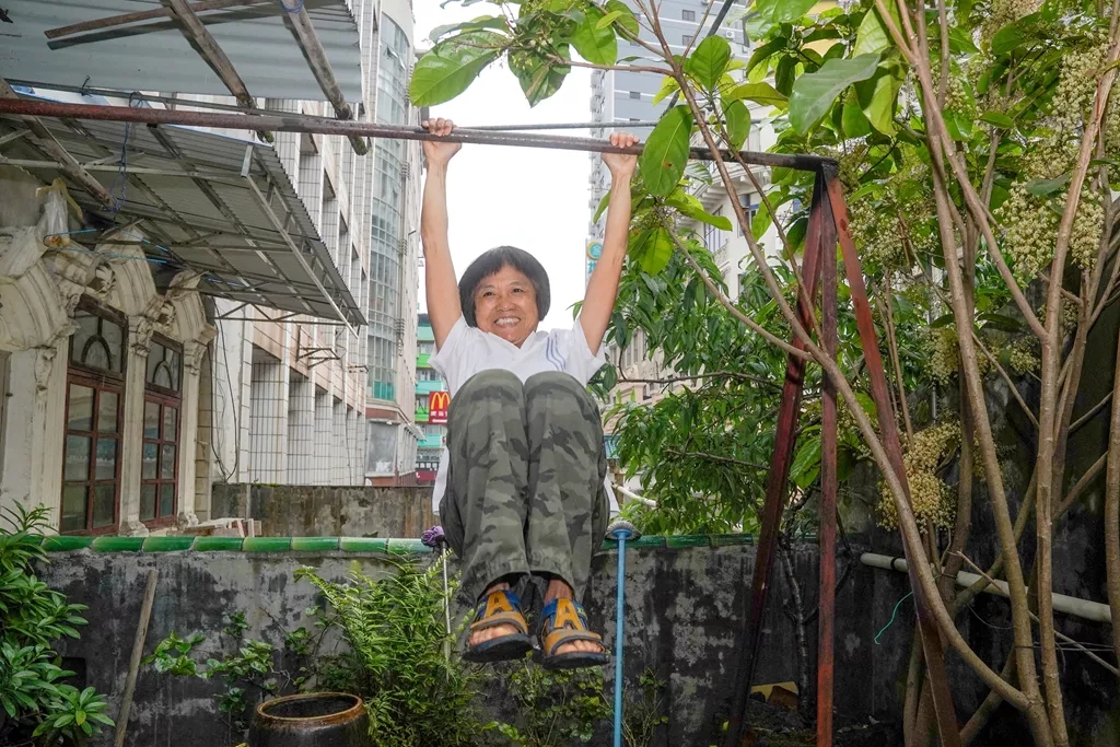瓊姨在陽(yáng)臺(tái)的單杠上鍛煉身體,她笑言騎樓城的這個(gè)陽(yáng)臺(tái)是對(duì)她的一種恩賜。