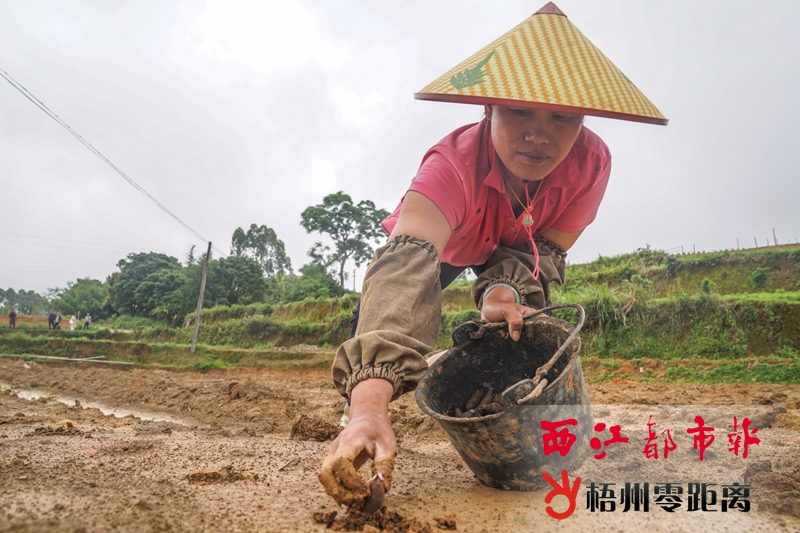 在岑溪市水汶鎮翰田村,村民正在將淮山種子埋進田里。記者 楊揚 攝