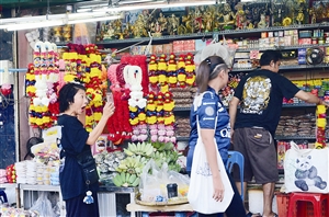 次日,我按平時(shí)出行慣例,起了個(gè)大早,往住處周邊隨意行走,才看清了酒店原來地處鬧市,生活氣息十分濃厚。狹窄而油膩的街巷兩邊,布滿了各種小吃店、水果攤、大排檔和雜貨店,汽車在其間飛快地擦身而過,摩托車呼嘯著穿梭往來。 右拐的小巷,兩間大排檔并排而開。一片嘈雜與無序中,讓人眼前一亮的,是混雜于各種小店中的鮮花店。 說鮮花店,并不十分確切。因這些店并不像國(guó)內(nèi)鮮花店,以經(jīng)營(yíng)花束為主,而是擺賣由茉莉花、萬壽菊、荷花、蝴蝶蘭等鮮花相間串起的花環(huán)。 泰國(guó)是佛國(guó),全國(guó)90%以上的人信奉佛教。泰國(guó)人對(duì)佛的虔敬,也體現(xiàn)在每日向佛敬獻(xiàn)鮮花上。街邊擺賣的這些花環(huán),就是用以供奉給佛的。 花環(huán)有大有小,有長(zhǎng)有短,有簡(jiǎn)單也有繁復(fù)。小花環(huán)以茉莉花和萬壽菊為主,茉莉花單取如珠狀的花苞,以鐵絲串成手環(huán)或項(xiàng)鏈狀;萬壽菊或單串,或間以數(shù)朵茉莉, 約合人民幣2元一個(gè)。隆重一點(diǎn)的,體現(xiàn)在花環(huán)的長(zhǎng)度和花朵的種類上,仍然以茉莉或萬壽菊為主花,間雜以含苞的粉荷花和未成熟的百香果,色彩濃烈,氣味芬芳。 轉(zhuǎn)角的鮮花店,店主是個(gè)濃妝的中年女子,黑衣黑褲、紅襪短發(fā),右手持手機(jī),左手持花環(huán),表情夸張地在線向客人推銷。一只大黃狗伏在地上,眼神恬靜地注視著自己熱情的女主人。 身畔匆忙走過的,是著日常裝的家庭主婦。無一例外地,她們兩手沉甸甸地提著的,是各種水果、蔬菜和一環(huán)環(huán)鮮花——花也是日常生活的必需品。花環(huán)每日更新,掛得哪里都是:神佛前、汽車駕駛座甚至行道樹上。著黃袍懸黃缽沿街化緣的僧人隨處可見,有人當(dāng)街虔誠(chéng)向僧人下跪,聆聽佛的點(diǎn)化;有人低眉下跪,向僧人施以食物;有人雙手合十字,遙遙向著街對(duì)面寺廟的神靈祈祝平安。 我從家庭主婦、游客、行人、信徒與僧人混雜的人流中走過,花環(huán)上茉莉花與萬壽菊的濃烈香氣,隨熱浪與市集聲一波一波地襲過來。對(duì)面街上,一樹又一樹的紫花風(fēng)鈴,被風(fēng)吹落,又被風(fēng)卷起。 清幽清凈的華欣 華欣是距曼谷200多公里的一個(gè)海邊小城,以風(fēng)景清幽著稱,為泰國(guó)王室常駐之地,相較清邁、芭提雅等熱點(diǎn)旅游城市,多了一份難得的清靜。 從曼谷去往華欣的路上,也許因?yàn)榈貜V人稀,觸目皆是成片的荒地,荒地上是未經(jīng)規(guī)劃自由生長(zhǎng)的合歡樹和金急雨樹。合歡樹樹冠巨大如扇狀舒展,枝梢上粉色花如霞彩般綺麗多姿;金急雨又叫金鏈花,是泰國(guó)國(guó)花,一串串明亮的金花耀人眼目,從車窗外一掠而過。林清玄說此花謝時(shí)如亂雨紛飛,喻人之離別如金急雨花凋落于微風(fēng)顫抖的黑夜,那樣的意象,真美。 抵達(dá),放下行李即往酒店周邊村莊行走。合歡樹與金急雨樹自曼谷一路綿延至此,似老友一路相伴,鳥雀極多,鷓鴣聲聲自渺遠(yuǎn)的林間傳來。站在合樹下近距離地仰望,就有了熟稔之感。 樹下散落著數(shù)戶人家,有人家處則必供奉有神佛,以四面佛為主。四面佛即四面神,據(jù)說掌管人間一切事務(wù),東南西北四面皆以同一面孔、同一姿態(tài)示人,分別代表健康、事業(yè)、愛情與財(cái)運(yùn),又稱“有求必應(yīng)”佛。佛前無一例外地,重重疊疊掛滿花環(huán)。 時(shí)時(shí)有狗聞聲而出,沖人狂吠。正驚慌時(shí),面目黝黑的當(dāng)?shù)厝思皶r(shí)出現(xiàn),喝退群狗,雙手合十,友好地含笑致歉。在泰國(guó)逗留的幾天里,時(shí)時(shí)可見這樣親和友好的笑容,如野地里自由舒展的合歡樹,如隨風(fēng)晃蕩的金急雨花,消解了此地37攝氏度高溫帶來的燥熱。 次日的行程是往華欣10余公里外一個(gè)按希臘圣托里尼島風(fēng)格打造的主題公園。公園以藍(lán)白二色為主題色,白墻、白欄桿、深藍(lán)小窗、天藍(lán)花園木椅、海藍(lán)木門……一株株造型、花色各異的三角梅攀墻緣窗而開,無論是三角梅花色與墻、窗、門顏色的搭配,還是造型的布局與設(shè)計(jì)皆有巧思,活潑的、明朗的,不受約束的,出人意表的,迥然有別于國(guó)內(nèi)公園布局和用色的嚴(yán)謹(jǐn)和縝密。這大約也是這個(gè)年輕的佛教之國(guó)的一種別致的審美吧。 在華欣,逛一逛僅在每周六開放的周末夜市,是連身處其中的當(dāng)?shù)厝艘才d致盎然的一件盛事。夜市與白天集市于人來人往的喧鬧及商品的豐富多樣上并無二致,所不同的是商品的個(gè)性化,多以手工制作為主,家庭閑置不用的物品也可在夜市上叫賣——只要你的貨品足夠特別,足夠吸引人。 合歡樹下的一角空地上,有當(dāng)?shù)厝私M織的演出,正在表演的,大約是一出小戲劇,兩個(gè)男子,一個(gè)文雅,一個(gè)嬉皮,揚(yáng)聲你一句我一句地爭(zhēng)論不休,觀眾里三層外三層地圍著,看得津津有味,時(shí)時(shí)爆發(fā)出會(huì)心的大笑——世俗的,熱鬧的,也因此是大眾的。 置身川流不息的異鄉(xiāng)人群中,遠(yuǎn)遠(yuǎn)地觀看那臺(tái)上傾情表演的男子,驀然想起此刻千里之遙的家鄉(xiāng),黃槿樹下,或者大榕樹下的簡(jiǎn)易舞臺(tái)上,也正在上演著哪一出牛娘戲吧。眼前這異國(guó)的戲劇,與家鄉(xiāng)的牛娘戲,此時(shí),此地,此境