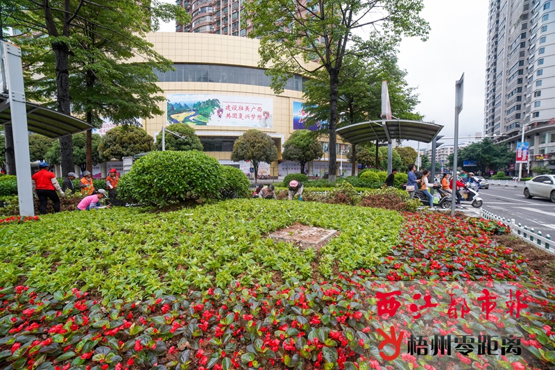 為美化市區(qū)主要道路,讓繽紛花色常駐,梧州市園林綠化工程處工作人員對(duì)市政府十字路口渠化島上種植的植物進(jìn)行更換,種下一批應(yīng)季的紅色海棠花和黃色雞冠花。記者 陳凡 攝