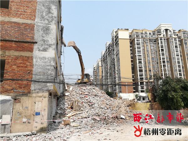 5月12日,迎賓路西段,施工人員操作器械拆除房屋。本次拆除工作涉及房屋3棟,總面積約3000平方米。