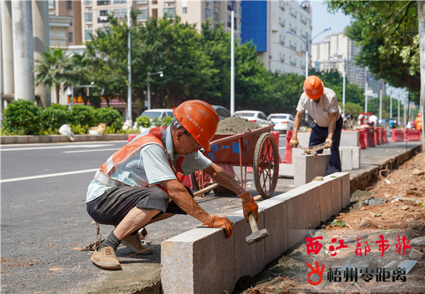 5月13日,中鐵一局施工人員在新興二路御山帝景小區路段更換人行道道牙。