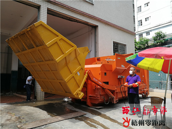 梧州零距離網-西江都市報訊(記者 吳艷虹 通訊員 陳焱)為改善垃圾中轉站衛生環境,減少對周邊居民生活的影響,近期,長洲區環衛站購置了兩臺新型垃圾連體壓縮箱,并在新興三路萬寶樓投用。 5月14日,在新興三路萬寶樓,記者看到樓前放置著一套橙色的垃圾連體壓縮箱,黃色的翻斗內裝載著少量垃圾,一名環衛工人坐在壓縮箱旁負責操作,不時有環衛工人駕駛著三輪垃圾車前來傾倒垃圾。當翻斗內的垃圾堆積到一定數量后,工人便通過機器操作,讓翻斗升起并180°旋轉,垃圾隨即全部掉入箱內,地上沒有掉落。另一方面,站內及東側入口通道的路面已經完全開挖,幾名施工人員正在開展測量工作。