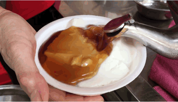 淋上桂花糖漿的豆腐花 冠伯說:“做豆腐花有很多條件要遵循,其中之一是溫度要控制好。如果點漿的時候溫度太高,豆腐花口感就會老,溫度太低又無法凝固,泡黃豆的時間也要根據(jù)季節(jié)氣溫變化而改變。做了那么久豆腐花,我也沒法百分之百成功,有時候在做豆腐花的過程中,出了一點差錯,就有可能失敗。”
