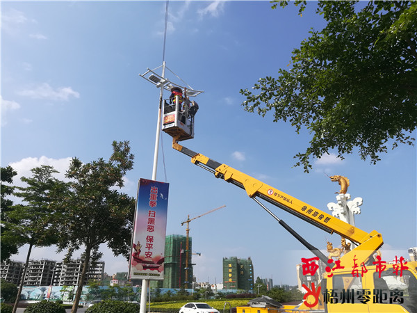 5月16日,梧州市路燈管理處工作人員正在龍魚雕塑周邊安裝帆船造型照明燈。