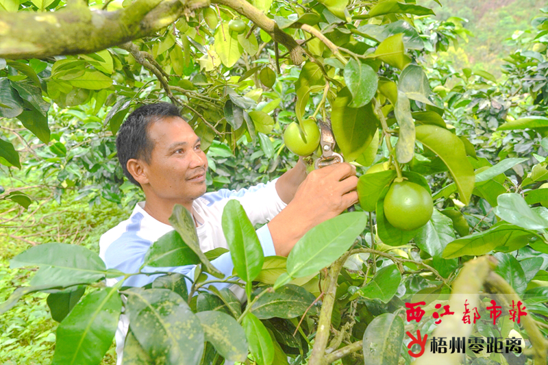 梧州零距離網(wǎng)-西江都市報記者 陳雨燕 通訊員 葉江 初夏時節(jié),走進岑溪市水汶鎮(zhèn)三村村的蜜柚種植基地,枝頭碩果累累。枝頭上青澀的蜜柚外,套上了一件件塑料“外套”。到今年7月底,蜜柚就能采摘銷售,這將為三村村的村民帶來可觀的收入。為大家?guī)磉@份“甜蜜”產(chǎn)業(yè)的,是村里的種植能手——華源蜜柚專業(yè)合作社社長羅波。