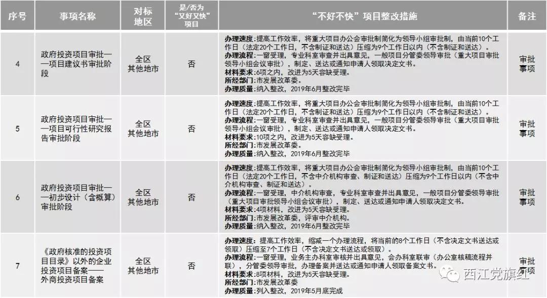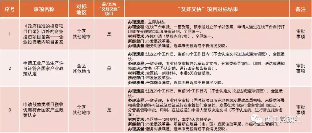 目前,各單位經過對標先進,已經梳理出本單位對外審批辦事服務事項。現對市發展改革委等4個單位對外審批辦事服務事項清單進行公示,邀請廣大干部群眾進行監督。 凡是不按規定提供行政審批服務、兌現辦理承諾的;服務辦事審批事項與先進地區相比“不好不快”但沒納入整改的或已納入整改但整改不到位的,都可以向梧州市營商環境建設問題投訴舉報平臺進行舉報投訴。投訴熱線:0774-3831000。其他單位的對外審批辦事服務事項,我們也將陸續對外公示。 一、市發展改革委 1.“又好又快”項目
