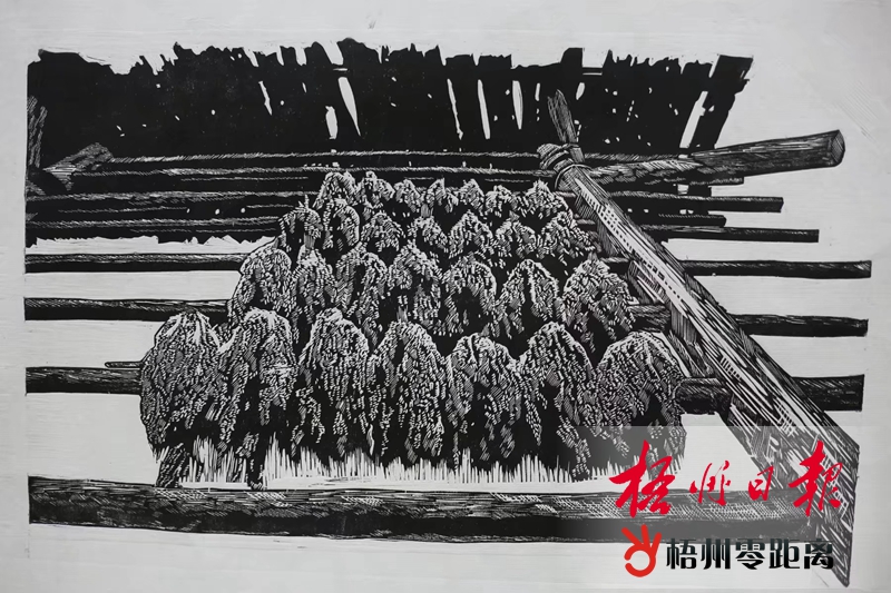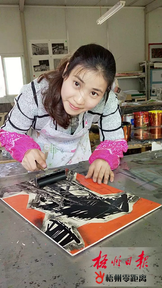 作品《大榕樹》。 欣賞著一幅幅感情充沛、充滿張力和沖擊力的版畫作品,很難想象,這些作品出自一個(gè)20來(lái)歲的年輕女孩之手。柯靜麗的版畫題材始終貫穿著大自然景致和新時(shí)代景觀,緊貼大地,緊扣豐收。在喜慶和希冀的細(xì)膩演變中進(jìn)行,這種演變使得她的版畫風(fēng)格日臻成熟。現(xiàn)實(shí)主義的刻畫手法,線條結(jié)實(shí)有力,富于現(xiàn)代沖擊力,輔之以豐富的內(nèi)容和介入的思想性。風(fēng)格上,展現(xiàn)出一種從抽象到形象,從現(xiàn)實(shí)到理想,從生活到藝術(shù)的過程。 品讀柯靜麗版畫作品,總會(huì)給人一種青春流動(dòng)的感覺。勾連起的,既是對(duì)激情燃燒時(shí)代的回憶,也是對(duì)藝海無(wú)涯的浮想。柯靜麗的版畫作品,既屬于時(shí)代浪花,也屬于她個(gè)人的生命畫卷。 一個(gè)涉世未深的文藝青年,為什么會(huì)選擇站在版畫這一藝術(shù)前沿,如此專注專心用情?對(duì)此,柯靜麗娓娓道來(lái):“從小我就愛畫畫,喜歡五顏六色的東西,初中便開始真正接觸美術(shù),選擇版畫是大學(xué)細(xì)分專業(yè)方向時(shí)做出的選擇。版畫不是用筆畫而是用刀創(chuàng)作,具有不一樣的挑戰(zhàn)性。”但在后面的創(chuàng)作中,不斷地鉆研和摸索,各種刀法的熟悉和運(yùn)用,讓柯靜麗慢慢地愛上版畫,喜歡不同的刀在板子上雕刻發(fā)出的聲音,當(dāng)創(chuàng)作過程中一點(diǎn)一點(diǎn)的效果在腦里形成并呈現(xiàn)在板子上時(shí),會(huì)感到激動(dòng)和興奮。“也許這就是版畫的魅力,讓我沉浸并陶醉其中。”柯靜麗說(shuō)。 藝術(shù)成績(jī)的取得,除了自身努力,也離不開名師指點(diǎn)。柯靜麗人生中遇到最難忘的人就是她的版畫導(dǎo)師梁練方。剛開始接觸凸版版畫,她對(duì)版畫一無(wú)所知。版畫是畫、刻、印三者的結(jié)合,創(chuàng)作木刻版畫以刀代筆,不似復(fù)制木刻那樣照刻筆畫的畫稿,要講究刀法,恰如書畫講究筆法一樣。刻畫和畫畫相反,是要先在腦子里組織好刀法,腦子要浮現(xiàn)最終印出來(lái)的效果,這些都梁練方老師一點(diǎn)一點(diǎn)地教會(huì)她,讓柯靜麗慢慢認(rèn)識(shí)版畫并愛上版畫。 有一次,柯靜麗在刻一所房子,腦子空白,一直不懂如何運(yùn)用刀來(lái)表現(xiàn)屋頂,她迷茫無(wú)助,甚至后悔當(dāng)初選擇了版畫,梁練方走過來(lái)對(duì)她說(shuō):“學(xué)版畫就像剛剛開始學(xué)寫字一樣,寫字要一筆一畫寫,刻畫也一樣,想清楚后再下刀,然后一刀一刀地慢慢出效果。”說(shuō)完后又幫她一點(diǎn)一點(diǎn)地分析房頂該用什么刀、呈現(xiàn)什么效果……就這樣,老師的耐心引導(dǎo)重新點(diǎn)燃柯靜麗對(duì)版畫的興趣。 柯靜麗注重處理工作與家庭、生活的關(guān)系,她的本職工作是小學(xué)美術(shù)老師,努力做好本職工作之余,她善于利用業(yè)余搞創(chuàng)作,注重藝術(shù)充電。一有空余時(shí)間,她就去仔細(xì)揣摸優(yōu)秀的版畫作品或者去看版畫的畫展,從中汲取藝術(shù)養(yǎng)分。柯靜麗堅(jiān)信,時(shí)間就像海綿里的水,只要喜歡就一定能擠出時(shí)間。 柯靜麗的作品,始終體現(xiàn)源于現(xiàn)實(shí),閃爍著人性關(guān)懷的亮點(diǎn)。柯靜麗認(rèn)為,藝術(shù)在教育的影響越來(lái)越凸顯,美術(shù)作為創(chuàng)造性的產(chǎn)物,寄托著人的理想與憧憬,它具有超功利性的特點(diǎn),并作用于現(xiàn)實(shí)生活,時(shí)代不斷向前發(fā)展,美術(shù)的腳步也跟著時(shí)代不斷向前走。 近幾年,家鄉(xiāng)變化日新月異,談到創(chuàng)作愿景時(shí),柯靜麗也把目光投注到自己的身邊,希望自己能創(chuàng)作出更多有廣西特色的版畫作品。 近幾年,柯靜麗的藝術(shù)創(chuàng)作成果頗豐,先后創(chuàng)作了版畫作品《梯田》《豐收》等,而版畫作品《豐收季節(jié)》入選慶祝廣西壯族自治區(qū)成立60周年廣西女性藝術(shù)作品展;版畫作品《黑白木刻(傳承)》在“巾幗心向黨 喜迎十九大”——廣西女性書畫攝影作品比賽中榮獲美術(shù)類三等獎(jiǎng);版畫作品《梯田》入選“新的征程——喜迎十九大召開暨梧州建城2200年系列活動(dòng)”,還參加了柳州美術(shù)書法作品邀請(qǐng)展…… “小荷才露尖尖角,早有蜻蜓立上頭。”柯靜麗就像一只立在藝苑枝頭上的蜻蜓,展翅欲飛;也像是一朵映日的荷花,在廣闊的藝術(shù)天池,開出令人矚目的“別樣紅”。 |
