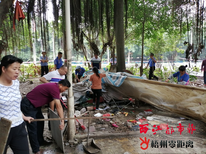 當天,由長洲區興龍辦、龍新村村委牽頭,梧州市城市管理執法支隊聯合長洲執法大隊、打非隊等部門組成約150人的隊伍,對西江汊河橋周邊約500平方米的衛生死角進行清理整治,拆除違章搭蓋,清理垃圾、雜物5車,還路于民。