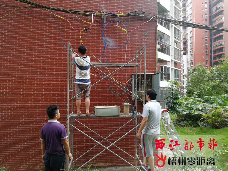 5月20日,施工人員在為紅嶺1號(hào)小區(qū)二期5幢的電線進(jìn)行增線擴(kuò)容。 記者 朱元冬 攝