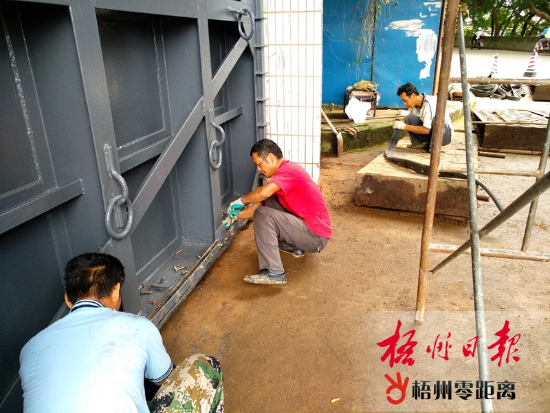 5月27日,在位于白鶴觀門前的防洪閘門,工人正在更換閘門的止水膠。