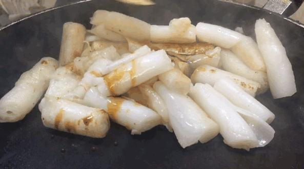 果然,咖喱魚蛋和香煎腸粉一經(jīng)推出,很受學(xué)生歡迎,尤其是香煎腸粉。就這樣,生意漸漸多了起來,不知不覺就做了8年。 如今大中路人氣不如當(dāng)年,但外賣提供的便利,讓人們不必到店里,也能嘗到美味,“咖喱王”是很多食客學(xué)生時代的味覺記憶,可以偶爾叫份香煎腸粉外賣滿足自己的胃。 阿毛說:“雖然我這里叫‘咖喱王’,但其實招牌并不是咖喱,而是香煎腸粉,美味的秘訣就在于火候的掌握和秘制醬汁。” 食俠見到,老板阿毛先將平底鍋預(yù)熱放油,再把雪白的豬腸粉一股腦倒入鍋中,輕輕翻面,待腸粉表面煎至微黃,撒下一些醬油調(diào)味,此時,鍋里“滋滋”的響聲讓人直咽口水。