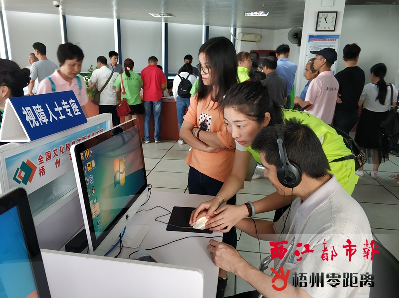 梧州零距離網-西江都市報訊(記者 陳素雅)5月28日上午,市內的殘疾人及社會公益團體的志愿者近百人來到梧州市圖書館(新館),共同開展2019年梧州市殘疾人文化周主題活動。市圖書館為參加活動的視障人士發放了智能聽書機,并向殘疾人朋友介紹了館內無障礙設施的使用方法。