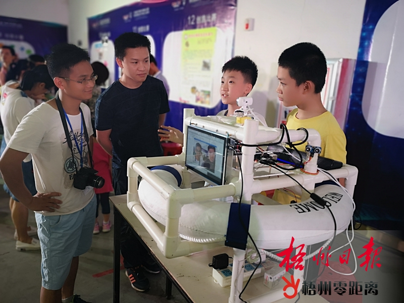 梧州市第一中學的參賽學生帶著創作的機器人作品參賽。