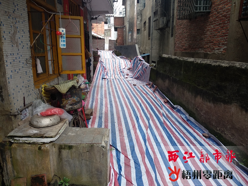 上沖二級17號對出道路已被三色布覆蓋,在道路左側居住的居民出行受影響。 姚藍婷 攝