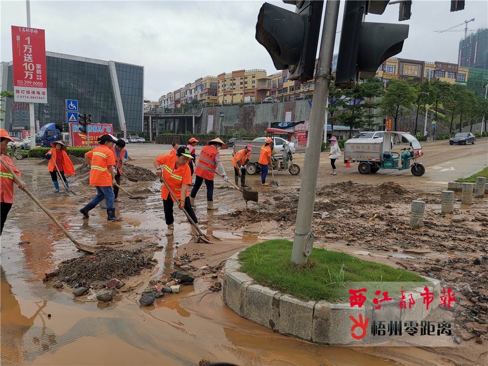 梧州零距離-梧州日報訊(記者 曾燕)受強降雨天氣影響,5月31日下午,市區(qū)大雨來襲,城區(qū)內(nèi)多條街道受浸。雨水退去后,毅德城對出路段、新聞路至寶石園小區(qū)等路段均出現(xiàn)泥沙淤積路面現(xiàn)象。 為創(chuàng)造整潔的城市環(huán)境和人居環(huán)境,6月1日7時許,長洲區(qū)環(huán)衛(wèi)站出動所有環(huán)衛(wèi)工人,全面、迅速地對泥沙淤積的道路及街道進行清理。當天上午,毅德城對出路段積水已經(jīng)完全退去,但地面上到處都是泥沙和垃圾,30多名環(huán)衛(wèi)工人先用鐵鍬將淤泥清理,再用高壓水槍對路面進行沖洗。