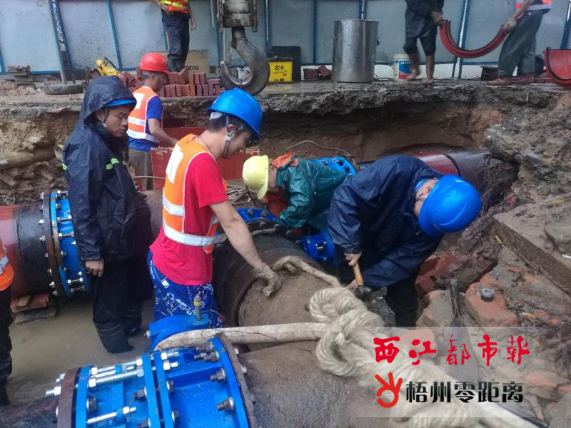 為確保梧州市河西片區供水管網安全,梧州粵海江河水務公司在5月31日開始,對太陽廣場對出3組供水管網主控閥門進行更換。為減少對周邊群眾用水影響,該公司維修人員冒雨連夜施工,經過11個多小時的奮戰,于6月1日9時恢復太陽廣場片區正常用水。圖為梧州粵海江河水務公司維修人員在太陽廣場對出供水管道搶修現場施工。