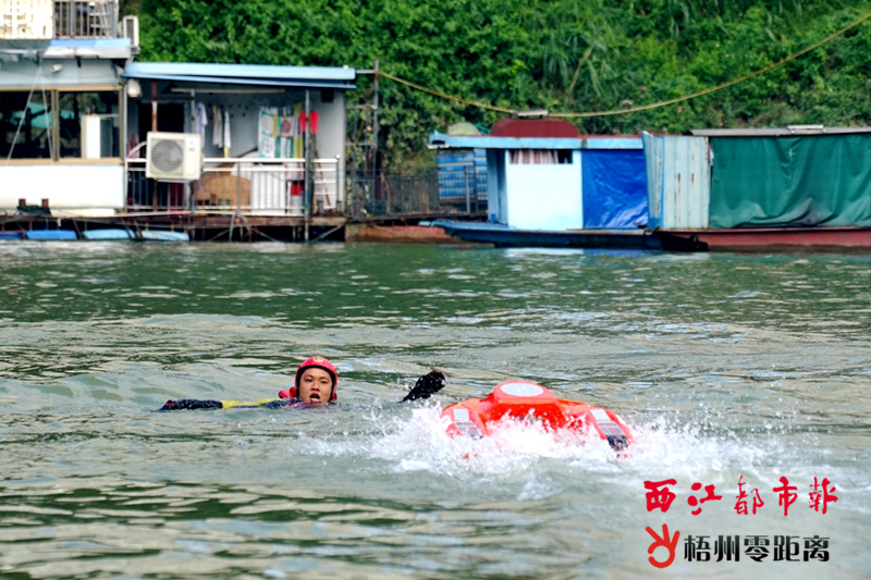 梧州零距離網(wǎng)-西江都市報訊 (記者 陳雨燕 通訊員 黃彬) 江面水流湍急,一名“落水者”在水中掙扎,此時一個體積小巧的水上遙控機器人破水前行迅速靠近落水者,然后利用拖拽的方法夾住落水者將其轉(zhuǎn)移,精準的救援贏得了岸邊圍觀市民的陣陣掌聲……這是梧州市消防救援支隊昨日開展水域救援實戰(zhàn)化演練的其中一幕。 為做好今年的防汛工作,通過實戰(zhàn)演練優(yōu)化作戰(zhàn)編成,規(guī)范水域災害處置程序,適應綜合性應急救援新常態(tài),昨天上午,梧州市消防救援支隊在水上消防中隊對出水域舉行了2019年水域救援實戰(zhàn)化演練。演練活動分別開展了橡皮艇編隊行駛操、活餌孤島救援操、舟艇快速救人操、水面機器人救援操、橡皮艇傷員轉(zhuǎn)運操、翻舟自救操、水下破拆操等項目,對瞬息萬變、險象環(huán)生的水域災害現(xiàn)場進行實況模擬。