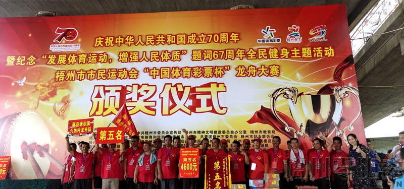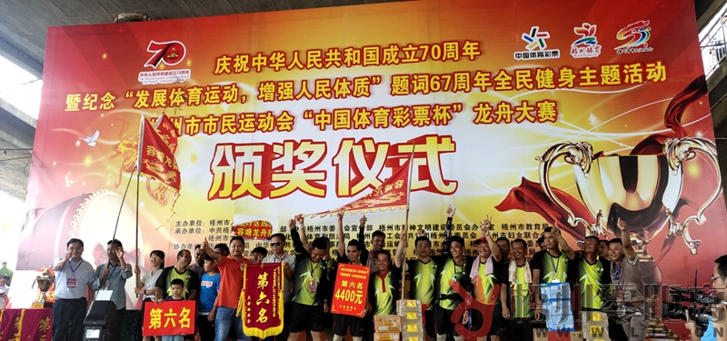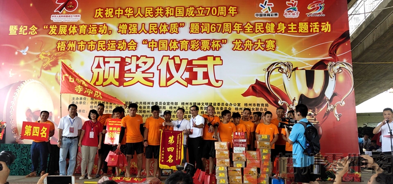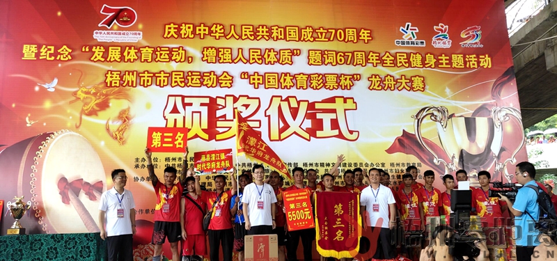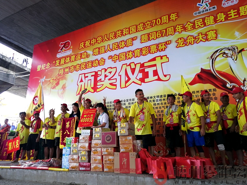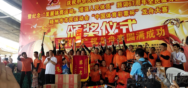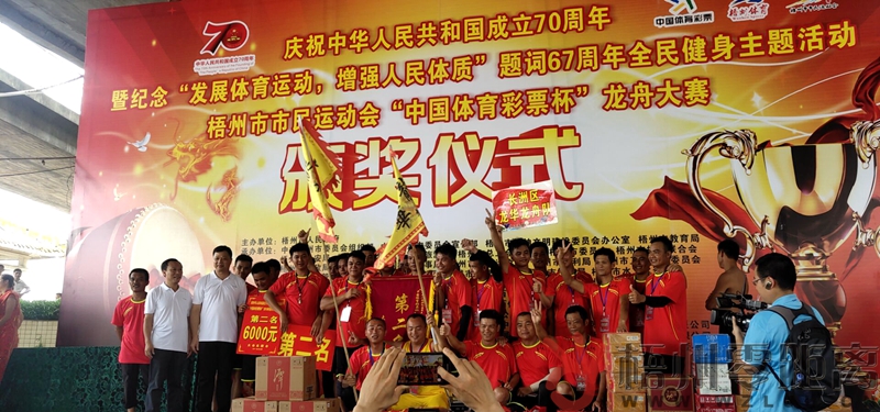 梧州零距離網訊 (記者 陳業漾)今日12時許,慶祝中華人民共和國成立70周年暨紀念“發展體育運動,增強人民體質”題詞67周年全民健身主題活動?梧州市市民運動會“中國體育彩票杯”龍舟大賽,在鴛江春泛舉行頒獎儀式。 經過一輪緊張激烈的角逐,本次龍舟大賽各參賽隊伍最終名次已經出爐。其中,龍圩區四合聯隊成功衛冕,獲得第一名,實現三連冠!長洲區龍華龍舟隊和藤縣濛江鎮時代華府龍舟隊分別獲得第二名和第三名。第四至第八名分別是:梧州廣日電梯長洲區寺沖隊,藤縣塘步鎮六坊村龍舟隊,龍圩區四合容塘龍舟隊,恒程汽車龍舟隊,赤水唯客體育龍舟隊。 市委書記、市人大常委會主任全桂壽,市委常委、宣傳部部長、副市長黃振饒,市政協副主席曹垂龍分別在儀式上為獲獎隊伍頒獎。