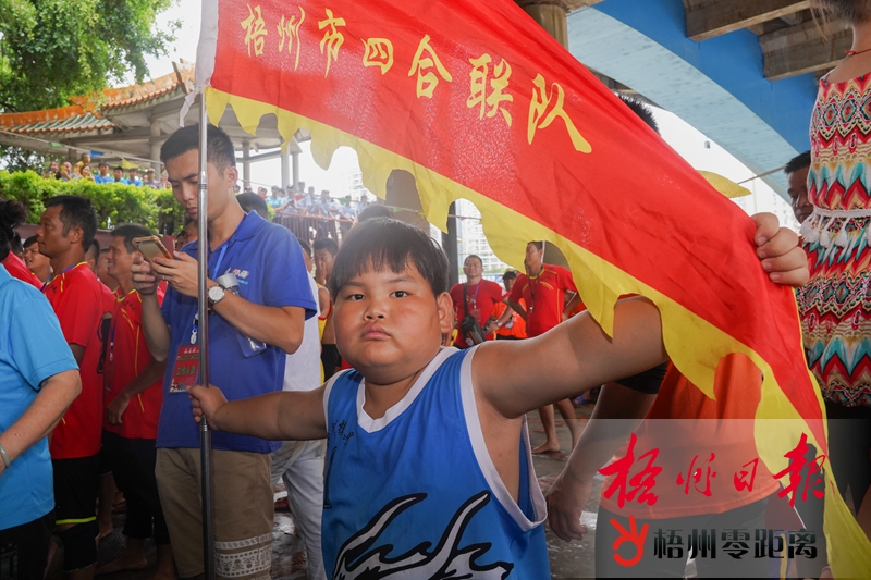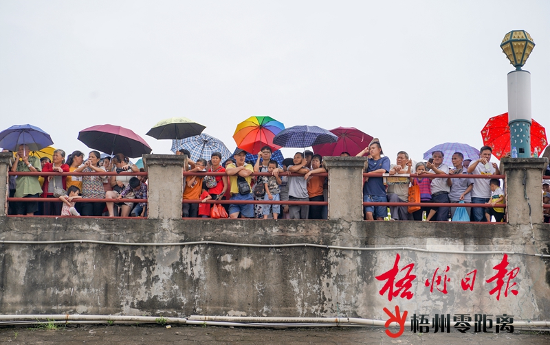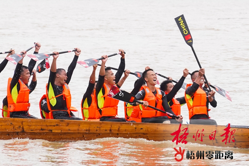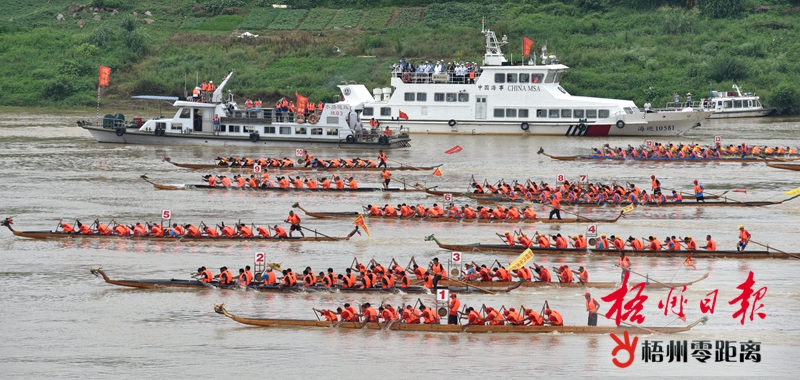 “砰”!上午11時,隨著發令槍響,13支龍舟如離弦之箭,在河面上劈波斬浪、疾速前行。“1、2、1、2……”隊員們奮力揮動著船槳,他們個個精神飽滿、意氣風發,響亮的口號喊起來,水花四濺、鼓聲陣陣。所有隊員朝著同一個目標前進,只為勇奪冠軍。 水上龍舟競渡百舸爭流,青壯男子奮力劃槳;群眾沿河而站,為龍舟大賽吶喊助威。激情四射的龍舟競渡讓在場市民熱情高漲,直呼“過癮”。今年65歲的劉女士拉上鄰居,特意從泗洲村趕到防洪堤觀看,“我起了個早,找了個好位置,近距離地觀看比賽。”劉女士激動地說,現場比賽很震撼,明年比賽還要繼續來看。 激烈的賽事也吸引眾多攝影愛好者,拍照者隨處可見。一位攝影愛好者脖子上架著3個“家伙”,“長槍短炮”一會兒對準威風的鑼鼓隊隊員,一會兒搶抓比賽精彩瞬間。而更多的市民則用手機記錄下精彩的一幕幕,發到微信群里或朋友圈與親朋好友共同分享快樂。 隨著時間的推移,比賽也逐漸進入到白熱化階段。龍舟上的運動員們隨著鼓聲奮力劃槳,遠看如同一支支離弦的箭。在冠軍爭奪戰中,龍圩區四合聯隊實力強勁,在過了500米位置的標志船后,便與后面的龍舟拉開距離,遙遙領先。長洲區龍華龍舟隊、藤縣濛江鎮時代華府龍舟隊和梧州廣日電梯長洲區寺沖隊互不相讓,為爭取更好的名次拼搏。觀看比賽的市民激情不斷被點燃,吶喊聲、加油聲和鼓聲交匯在一起。最終,龍圩區四合聯隊率先劃過終點線。