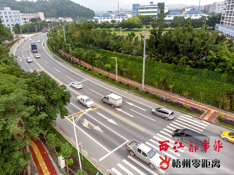 6月10日,梧州高新技術產業開發區的工業大道路段,路邊綠化帶郁郁蔥蔥,新增的交通標線、人行道清晰醒目,車輛通行有序。