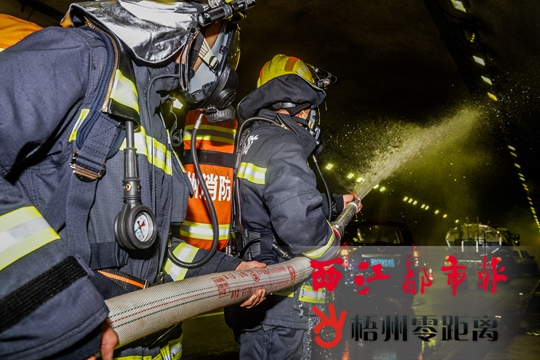 這是中冶馬梧高速聯合市消防、公安交警、交通部門及梧州市中醫醫院,在G65包茂高速上行線飛田隧道內開展突發事件應急處置演練的一幕。