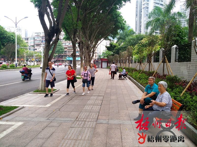 6月11日,在梧州日報社附近人行道,市民正坐在座椅上休息。