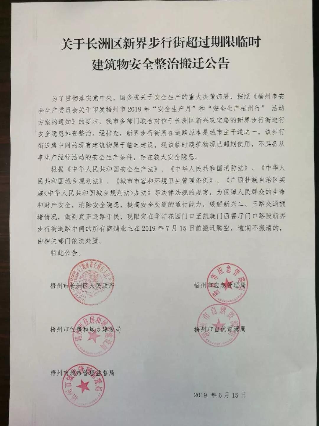 6月15日,長洲區人民政府、市應急管理局、市住房和城鄉建設局、市自然資源局、市城市管理監督局聯合發布了《關于長洲區新界步行街超過期限臨時建筑物安全整治搬遷公告》(下稱《公告》)。