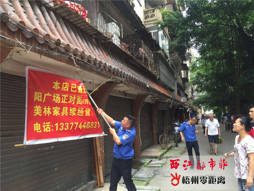6月17日,城管執(zhí)法人員正在新興小游園周邊清理違規(guī)戶外廣告。長期以來,小游園周邊的家具店鋪都存在跨門檻經(jīng)營情況。商戶把桌椅等商品擺放到店鋪前的人行通道上,影響市民正常通行。當天,萬秀城管執(zhí)法大隊聯(lián)合新興市場協(xié)管員對此處進行聯(lián)合執(zhí)法,暫扣一批沙發(fā)、桌子等物品,并拆除了8處遮雨棚。