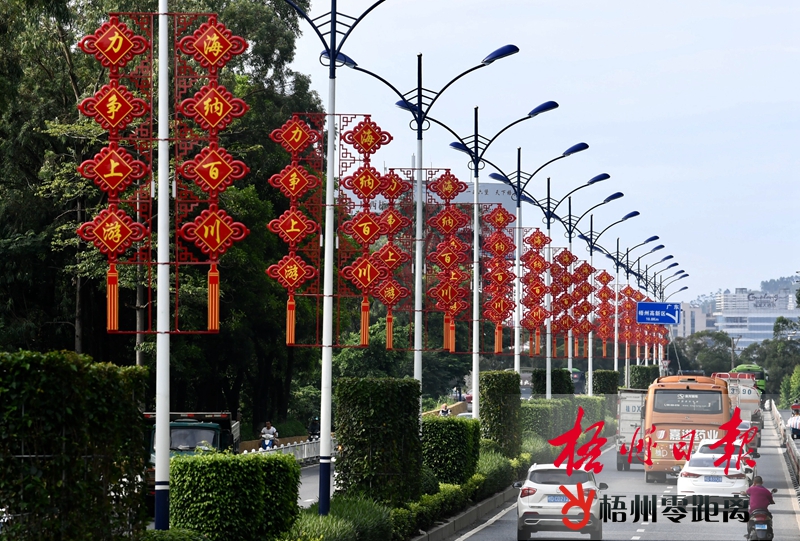 6月18日,在西江大橋往龍圩區的道路,路燈上掛裝著“海納百川、力爭上游”新時代梧州精神的中國結,在美化道路的同時,也使新時代梧州精神更深入人心。蒙紹松 攝
