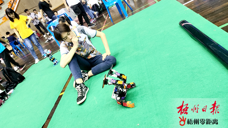 機器人隨著音樂的節拍擺動,動作和音樂節奏配合得當。 此次大賽,梧州學院組成五支代表隊,分別參加了機器人舞蹈項目雙足仿人賽(本科生組)和雙足競步項目交叉賽(本科生組),經過激烈角逐,由2016級電子信息工程2班的王賢鋒帶領的“Super Robot”和2017級電子信息工程3班的向倩帶領的“火星小分隊”榮獲機器人舞蹈項目雙足仿人賽一等獎,由2017級電子信息工程2班的占輝帶領的“手足無措隊”榮獲雙足競步項目交叉賽的一等獎。