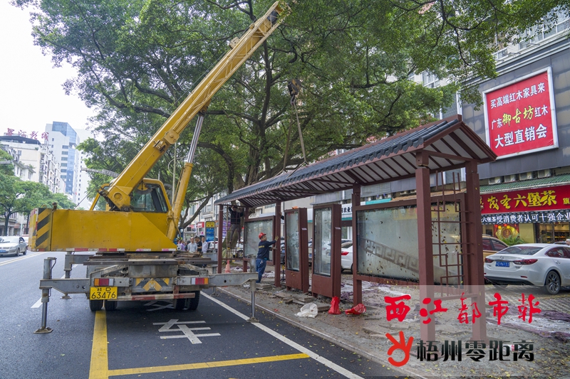 6月24日,在西江三路,施工人員將大廈站公交站臺改造為仿古樣式。