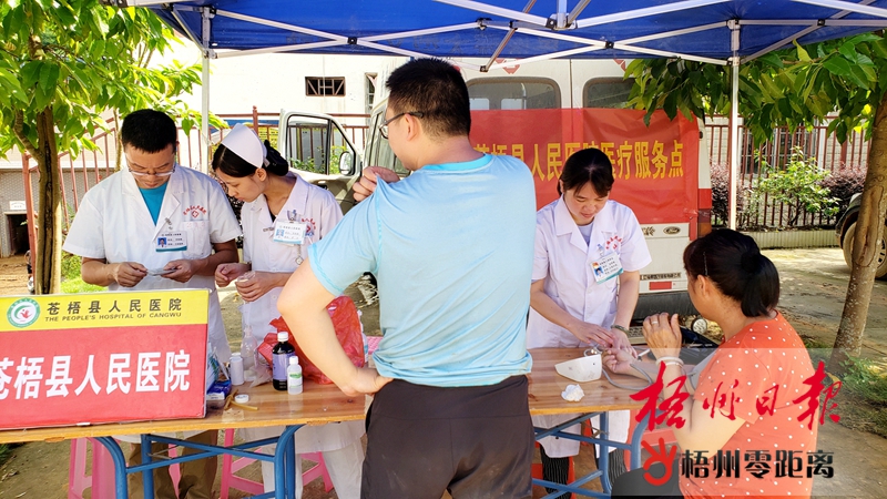 6月27日,在蒼梧縣六堡鎮,蒼梧縣人民醫院醫護人員在為受災群眾提供醫療服務。