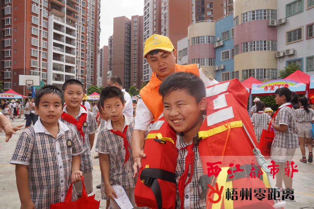 7月5日,在梧州市長紅小學,海事局工作人員教小學生正確穿戴救生衣和落水后的應急自救方法。 本報記者 楊揚 攝