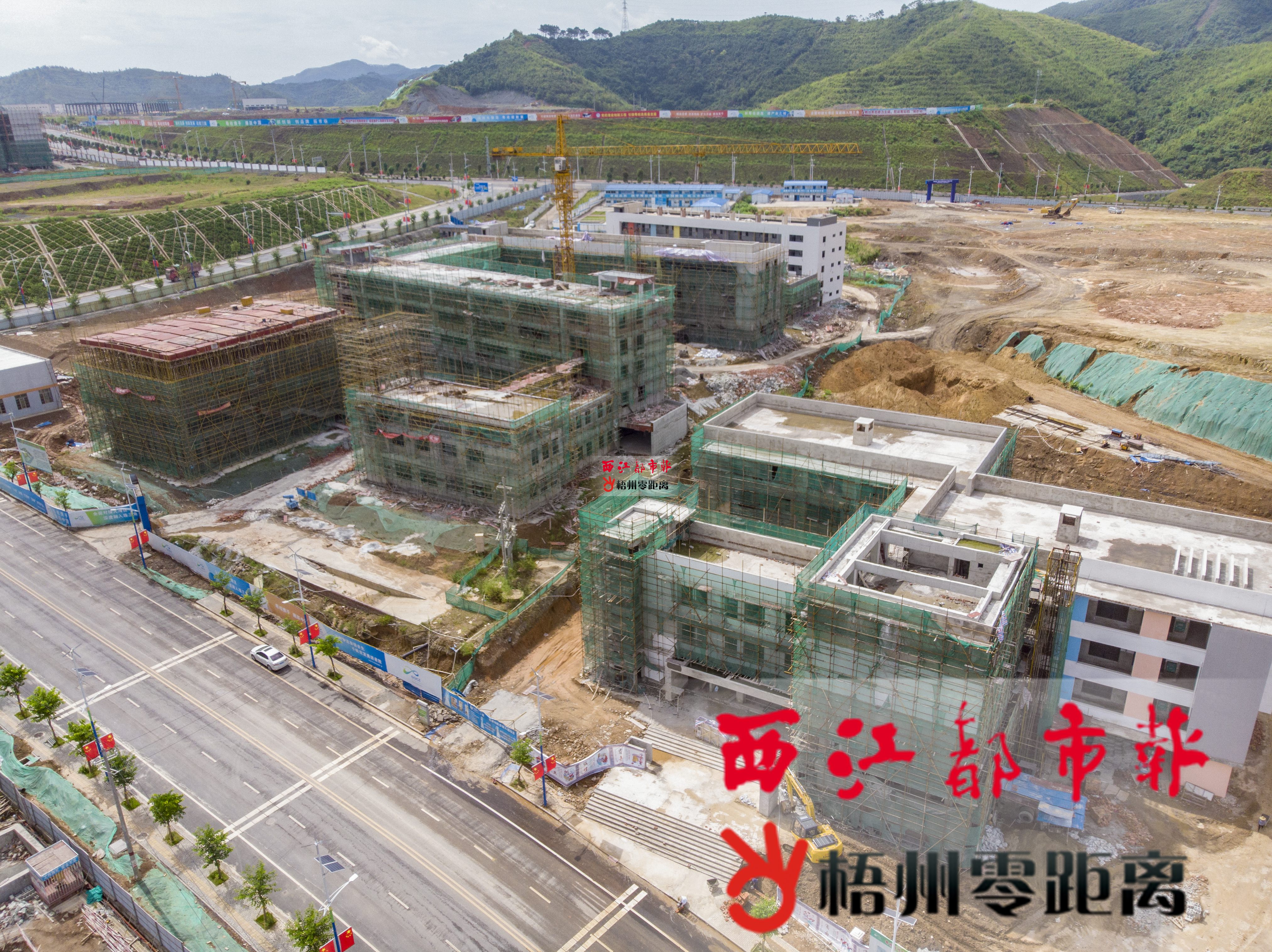 7月5日,梧州市旺步小學遷建項目(左、中)和旺步幼兒園項目(右)的大部分建筑主體已經封頂。